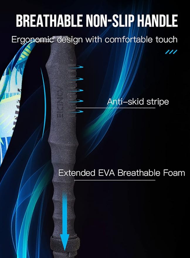 • 【Comfortable Non-slip Grip】Hiking sticks feature a comfortable EVA grip that provides a firm handgrip and makes the poles easier to hold without slipping even when your hand is wet. The poles also contain a comfortable moisture-wicking wrist carrying strap, so you never lose your poles. Built for those who conquer terrain no matter the weather conditions.