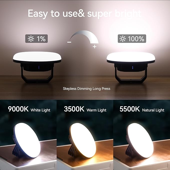 • [3 lighting modes & Stepless Dimming]: Our camping lights is dimmable, Short press to switch between 3 lighting modes (3500K/5500K/9000K), Long press to adjust brightness, providing you with the perfect lighting for any occasion, whether it's a cozy campfire setting or a bright emergency situation.