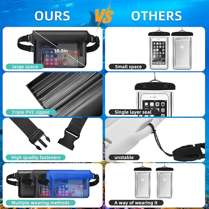 • SAFE AND DURABLE - Waterproof Fanny pack consists of Comfortable and practical PVC material and an adjustable belt to prevent your valuables from being scratched by rocks, sand or branches. The belt can also be used as a shoulder strap, hanging over the shoulders and chest. waterproof cellphone bag Very safe and convenient.