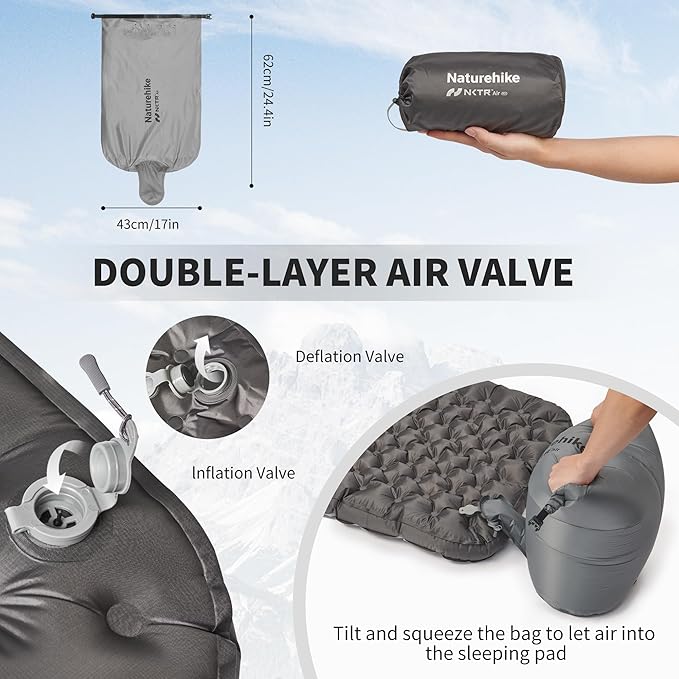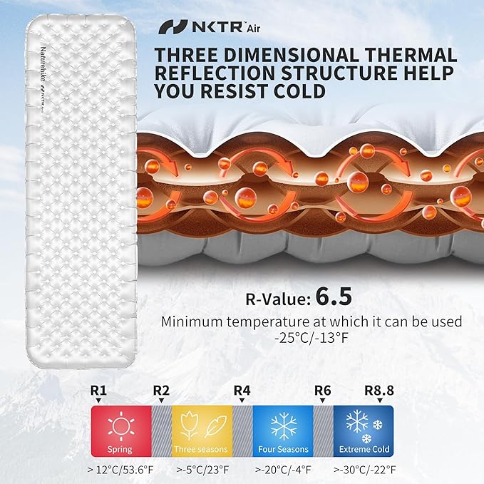 • 6.5 HIGH R-VALUE INSULATION: Naturehike ultralight air mattresses have a high R-value of 6.5 for warmth and insulation. Suitable for temperatures above -13°F/-25°C. 10cm ( 3.94in ) thicker design, both high resilience and anti-compression and shock absorption, peace of mind to block the ground
