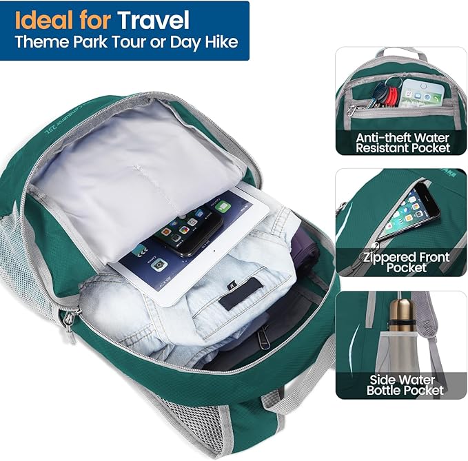 • Reasonable and Orderly: Our ultralight packable backpack capacity is 25L,and the pocket structure layout is reasonable and orderly.One main bag can accommodate sandwich lunch boxes and inner partitions to accommodate A4 paper size files;One inner bag can store important small items such as passports;2 front bags can store small booklets such as travel guidelines;2 side bags can store water bottles and umbrellas