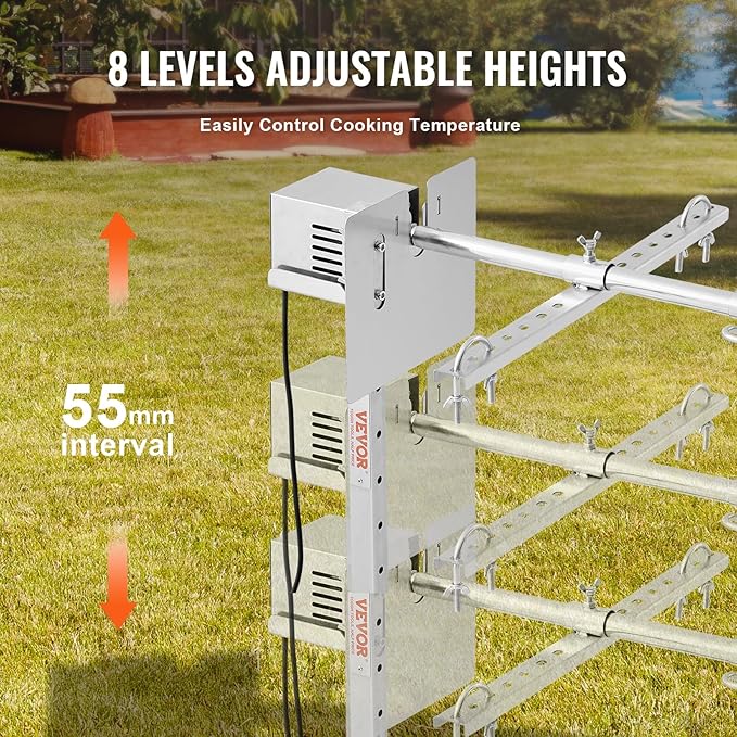 • Adjustable Heights: Designed with 8 different height holes, the grill rotisserie system can be easily adjusted. The bbq rotisserie grill kit is designed to control cooking temperature. The upgraded 45-degree tripod ensures stability even on grass.