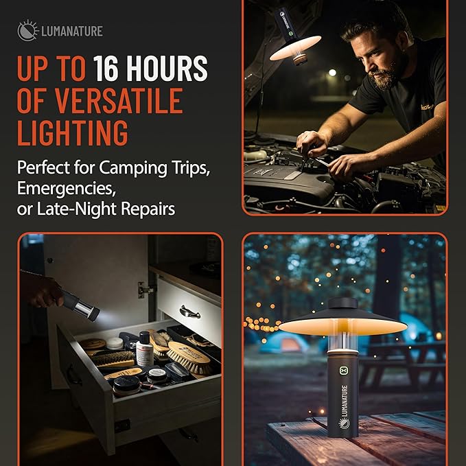 • RECHARGEABLE FOR LONG-LASTING POWER: Stay illuminated with 6–16 hours of battery life, depending on the mode. The USB-C rechargeable 2000mAh battery fully charges in just 3 hours, making this emergency lantern light perfect for extended camping trips, nighttime repairs, and survival situations without worrying about running out of light.