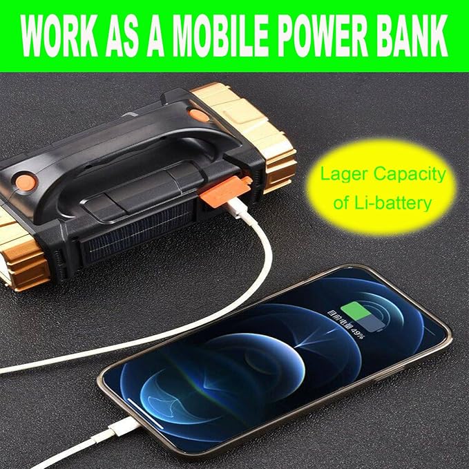 • USB CHARGING AND SOLAR POWERED, AS MOBILE POWER BANK: Solar powered or micro USB charging, 2 ways to makes full electricity, no need to worry about no power, especially in outdoor. The USB charging cable can charge by 5V USB ports. The USB output port at the bottom of the flashlight, it can serve as a power bank for your smartphone or mobile devices in emergency