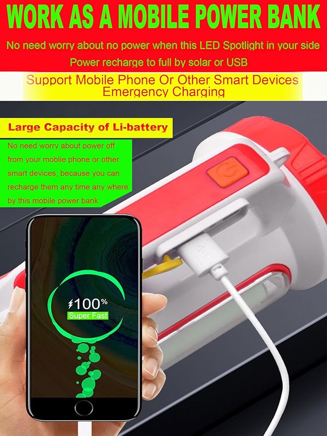 • 6 LIGHING MODES FOR YOU: The high lumens solar flashlights spotlight with 5 lighting modes, it can be used as as Spotlight: Strong light, weak light, and strong flash light; and lantern: strong light and weak light. So you can easily meet every lighting emergency with this super bright led search soprtlight lantern