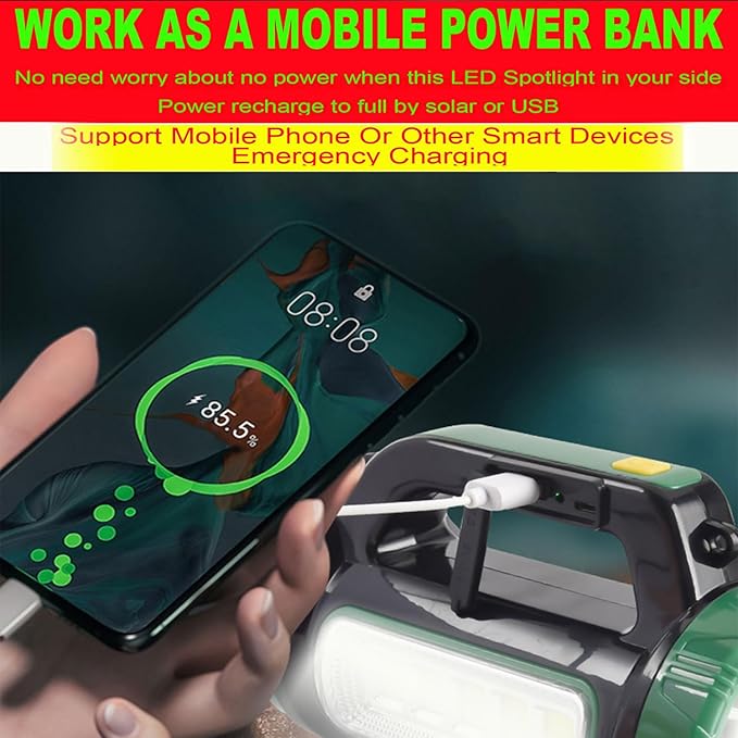 Solar LED Searchlight Spotlights, Rechargeable Super Bright 10000LM Handheld Spotlight Lantern, Multifunctional LED Lamp Camping Work Light, 6 Light Modes, Power Bank, IPX4 Waterproof
