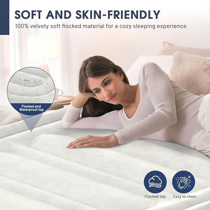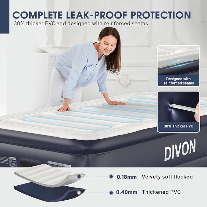 • 【Luxuriously Comfortable Waterproof Flocked Top】DIVON Twin Air Mattress features a velvety, waterproof flocked surface that’s soft, easy to wipe clean, and provides ultimate comfort for restful sleep every night. Experience an unparalleled sleeping experience with its luxurious design