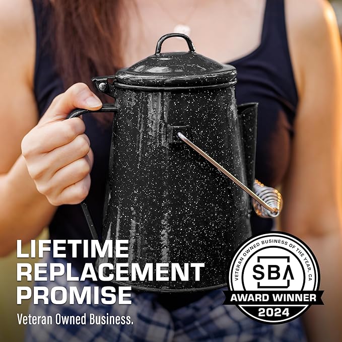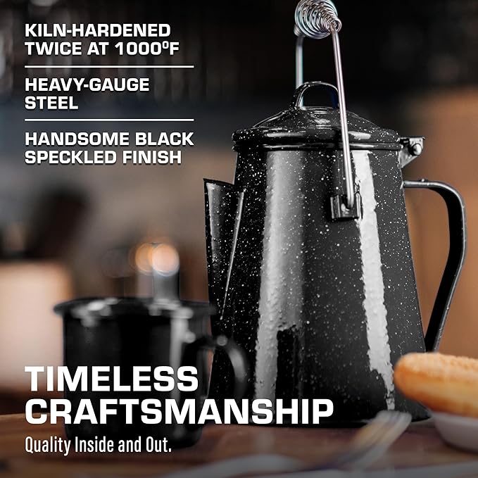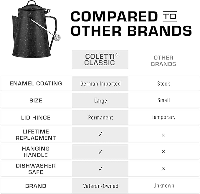 • TIMELESS CRAFTSMANSHIP—Built for the Wild, Crafted for a Lifetime – The COLETTI camping coffee pot is built to outlast the journey. Forged from reinforced steel and coated with imported German enamel, this camp kettle embodies classic outdoor cookware. Whether brewing cowboy coffee over open flames or boiling water on a stovetop, it delivers hot, pure, and steady coffee—because every great adventure starts with great coffee.