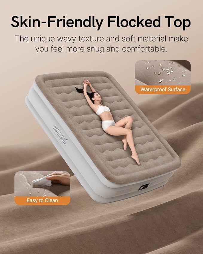 • Comfort Flocked Top - The queen inflatable mattress is made of comfortable waterproof flocked top layer and multi-layer PVC, which is more tough and wear-resistant. While the queen air mattress has a non-slip strip on the bottom to provide stability, reduce noise and prevent slipping