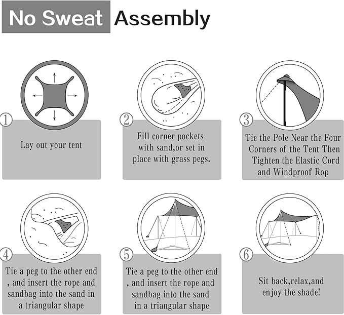 • STABILITY FEATURE:The beach shade canopy is supported by four aluminum poles (diameter 0.75 inch) and four large sandbags, along with 4 windproof ropes. They form a stable triangle that makes the tent highly wind-resistant.