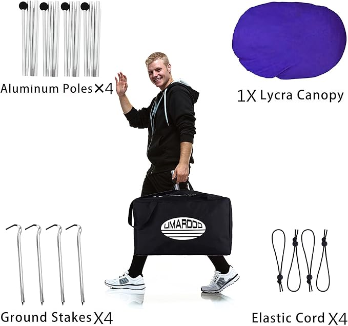 • DURABLE BEACH SHADE CANOPY: The strong and elastic Lycra fabric has UPF 50+ protection and water-resistant function. Rust-proof aluminum poles are attached with a elastic cord preventing moving.