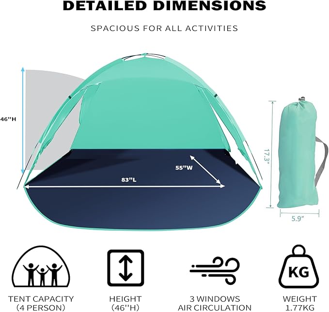 • Spacious & Portable Design – With dimensions of 83" L x 55" W x 46" H, this tent comfortably fits 3-4 people while remaining lightweight and easy to transport in a compact carrying bag. Ideal for family outings, beach relaxation, and outdoor adventures.