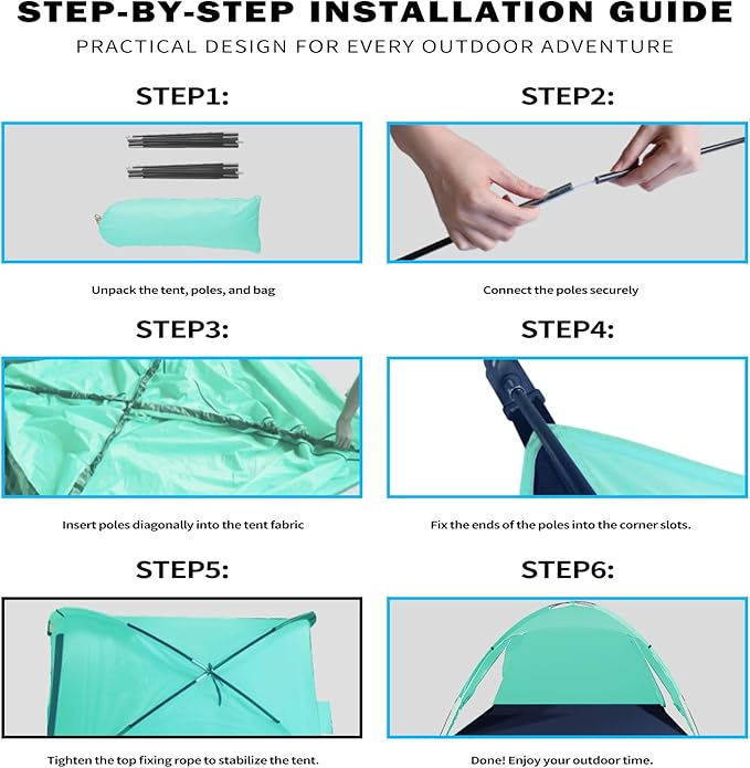 • 8.0mm Reinforced Fiberglass Poles for Stability – Constructed with thickened 8.0mm fiberglass poles, this beach tent offers enhanced durability and flexibility, ensuring a stable structure that withstands frequent outdoor use.