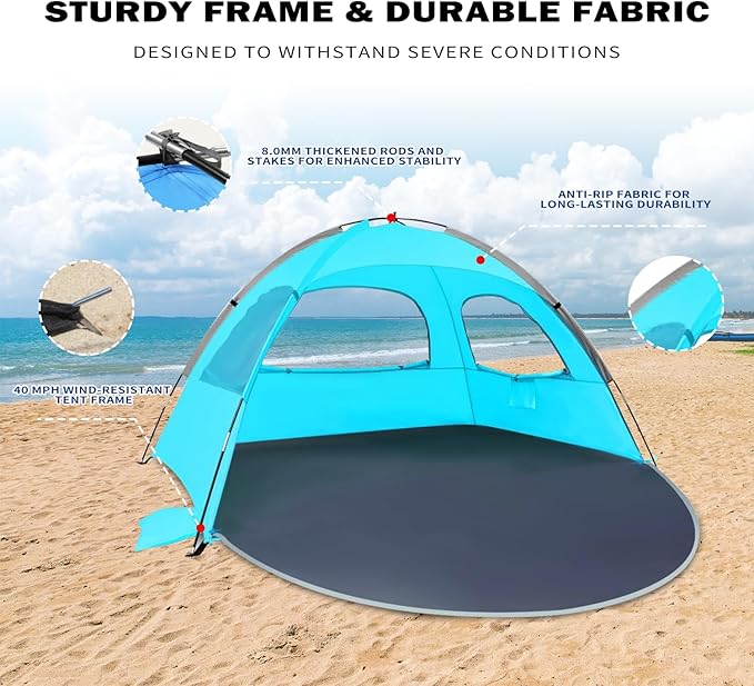 • 8.0mm Reinforced Fiberglass Poles for Stability:Built with thickened 8.0mm fiberglass poles, the Outterra beach tent is sturdier, more flexible, and durable, ensuring a stable structure that withstands frequent use and outdoor conditions.