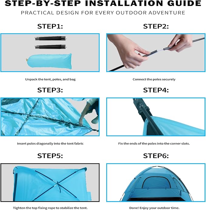 • UV Protection & Excellent Ventilation:Made from premium 210T polyester fabric, Featuring UPF50+ sun-blocking fabric, this tent shields you from harmful UV rays, while the three mesh windows allow for optimal ventilation and cooling.