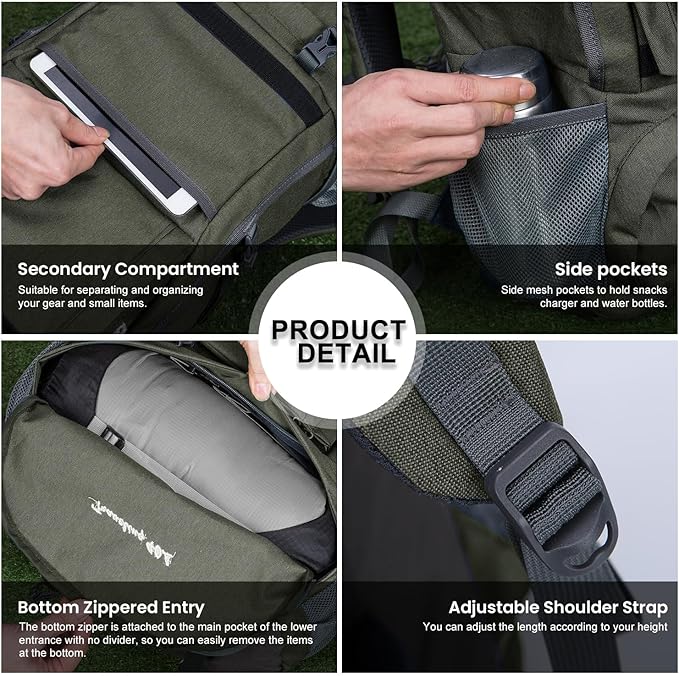 • Well-designed details: This outdoor backpack has many clever and convenient designs. The bottom compartment provides direct access to the main compartment; there is also a dedicated compartment for a water bladder (WATER BLADDER NOT INCLUDED), In addition, various shrink straps can also carry camping equipment such as trekking poles, sleeping bags and tents.