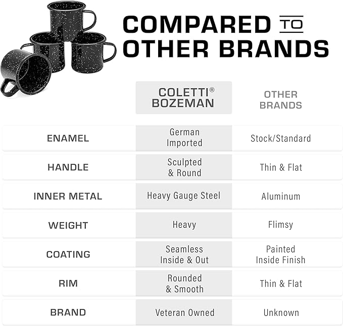 • DURABLE — Camping Tough: At the center of each COLETTI Classic Camping Mug is a thick metal mug. We’ve built our camping mugs to be as tough as your most exciting adventure. And as enjoyable as your most cherished moments