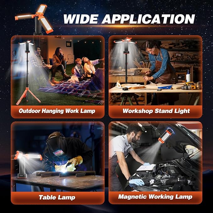 • 【Multi-Functional Camping Light】Saker camping light with stand fixtures have three rotatable light panels that can be adjusted vertically by 180 ° and horizontally by 270 °, allowing for precise adjustment of lighting angles in multiple directions. The work light is detachable and its magnetic base is equipped with a hook, providing more possibilities. It can be turned into a flashlight, high ceiling lamp, desk lamp, and backpack lamp. Whether you are lighting up at an accident scene, working in a garage, or sitting at a campsite, ourrechargeable camping light can meet your needs.