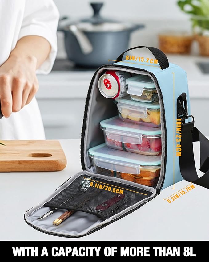 • Large Capacity & Smart Storage:With dimensions of 9 x 9 x 10.5 inches, the spacious main compartment fits three to four food storage containers. The front drawstring pocket accommodates most popular water bottle brands and sizes with handles or straight designs. Side mesh pockets and an interior net compartment keep utensils, keys, and essentials organized.