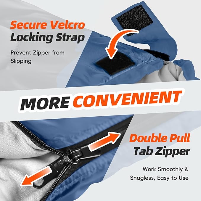 • EXCELLENT DESIGN : The double pull tab zipper on the right side makes it easy for you to open and close from inside or outside, work smoothly & snagless. The zipper at the bottom lets you ventilate the foot section for better temperature control. On warm nights, unzip it and use like a blanket