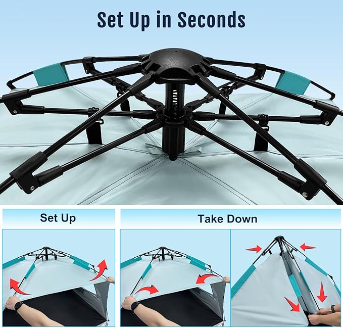 • Outdoor Protection & Great Ventilation - Premium 210t sun-proof material plus a special embedded silver-coated material to provide great UV protection from the sun and 3 added roll up openings maintain airflow to keep the tent cool when staying inside.
