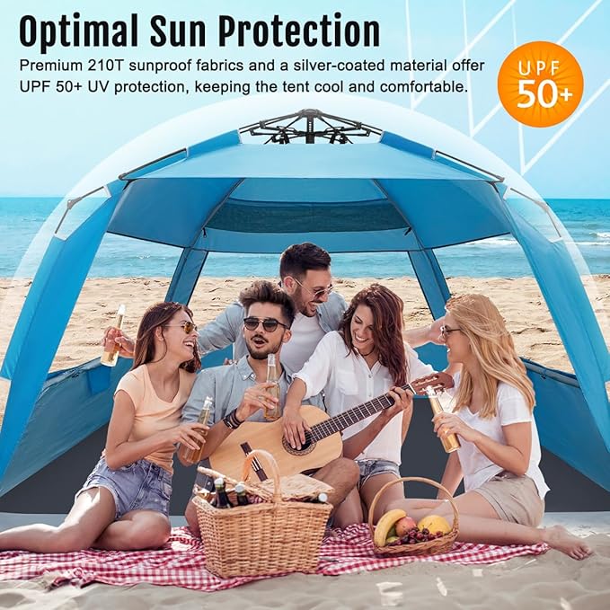 • Outdoor Protection & Great Ventilation - Premium 210t sun-proof material plus a special embedded silver-coated material to provide great UV protection from the sun and 3 added roll up openings maintain airflow to keep the tent cool when staying inside.