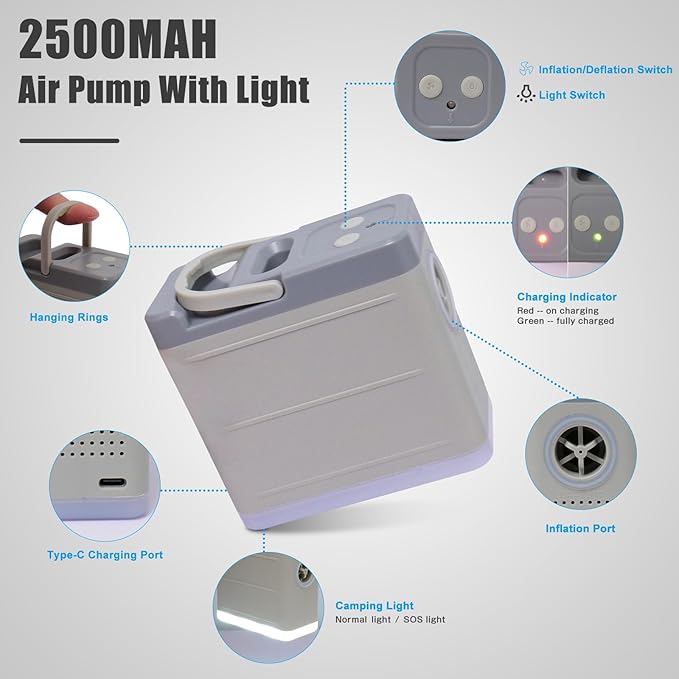 • 【𝐌𝐮𝐥𝐭𝐢-𝐟𝐮𝐧𝐜𝐭𝐢𝐨𝐧𝐚𝐥 𝐈𝐧𝐭𝐞𝐥𝐥𝐢𝐠𝐞𝐧𝐭 𝐀𝐢𝐫 𝐏𝐮𝐦𝐩】-The built-in air pump contains 2*2500mAh high capacity battery, can fill the camping pad in 45S. Pump is rechargeable and detachable. A full charge 3.5 hours can inflate the pad about 7 cycles. The normal light of pump for campsite illumination and the SOS light feature for emergencies. it also has a hook to be attached to the tent. Pls don't run the pump continuously for over 5 mins. Let it cool down before the next use.