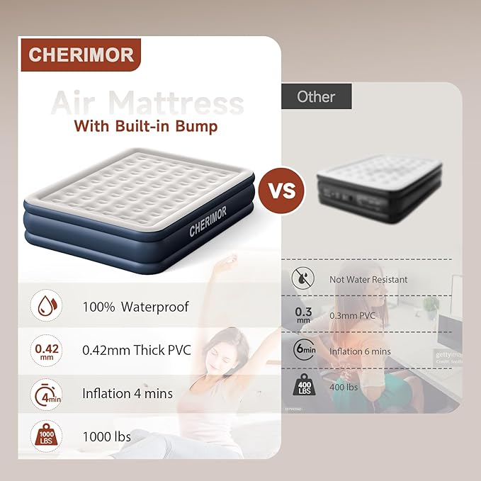 • Material Enhancement: The bottom of the CHERIMOR blow up mattress is equipped with industrial-grade and heavy-duty grippy material to ensure stability. The entire air bed is constructed with 0.42mm thick composite PVC, making it 40% thicker than comparable products on the market, enhancing its durability and waterproof properties.