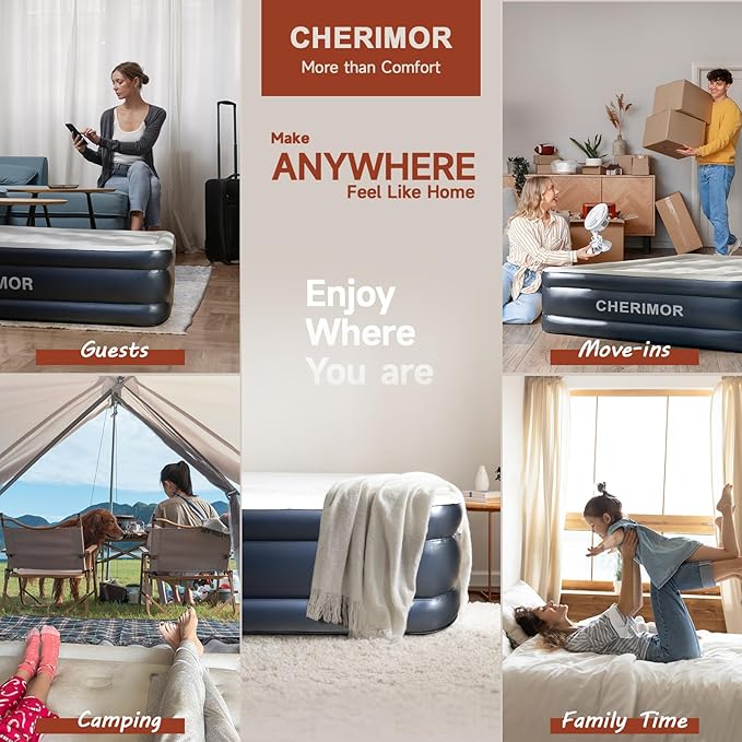• Wide Applications for Your Convenience: It comes with a carrying bag for convenient portability and storage, simplifying the process of packing, transporting, and storing the inflatable bed. Whether for home use, travel, hosting guests, moving, or office needs, it meets your high-quality rest requirements anytime, anywhere. The CHERIMOR Air mattress ensures you sleep comfortably, wherever you are.