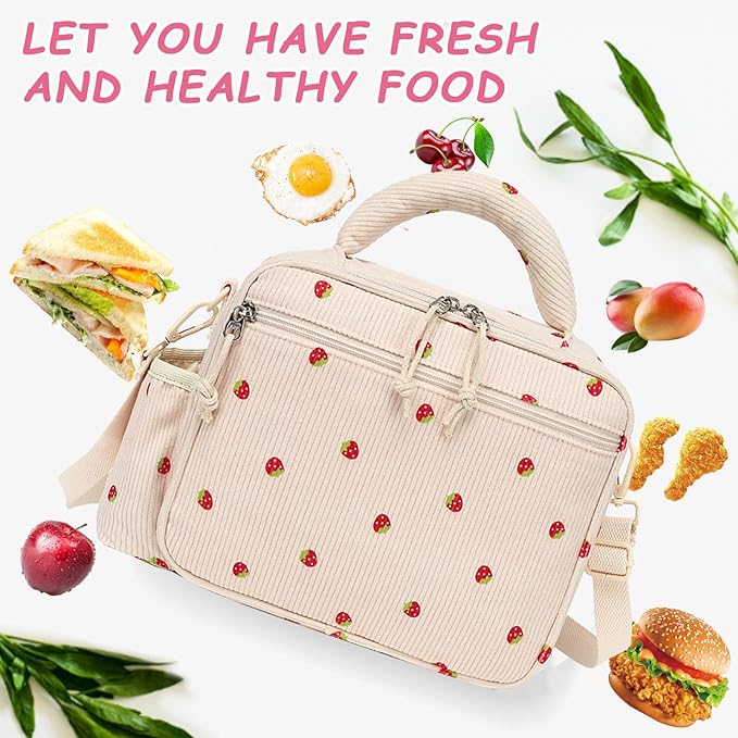 • The Reusable Lunch Box is made of the durable strawberry corduroy material,food safe insulated lining and sturdy double SBS zippers.The padding, stitching, fabric, liner, and overall construction is quality.Lunch bag with adjustable shoulder strap, which provides three carrying ways: shoulder bag, cross-body bag or chic handbag.