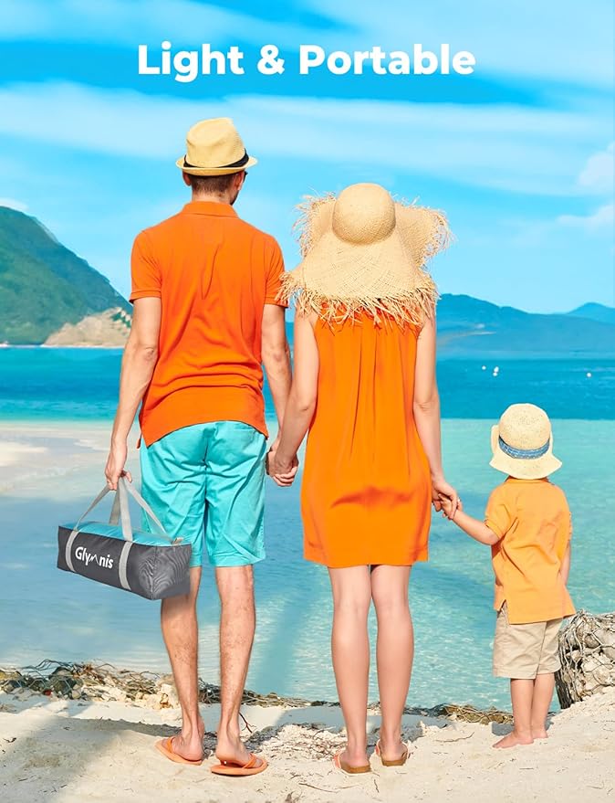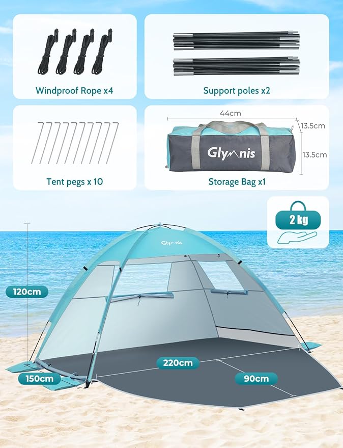 • Lightweight and Portable: The Glymnis beach shelter has a small storage volume, only 44×13.5×13.5 cm, and weighs 2 kg. It can be effortlessly packed into a backpack, suitcase or car trunk, saving space. With its handy carry bag, you can easily take it with you. It is your ideal companion for leisure and vacation
