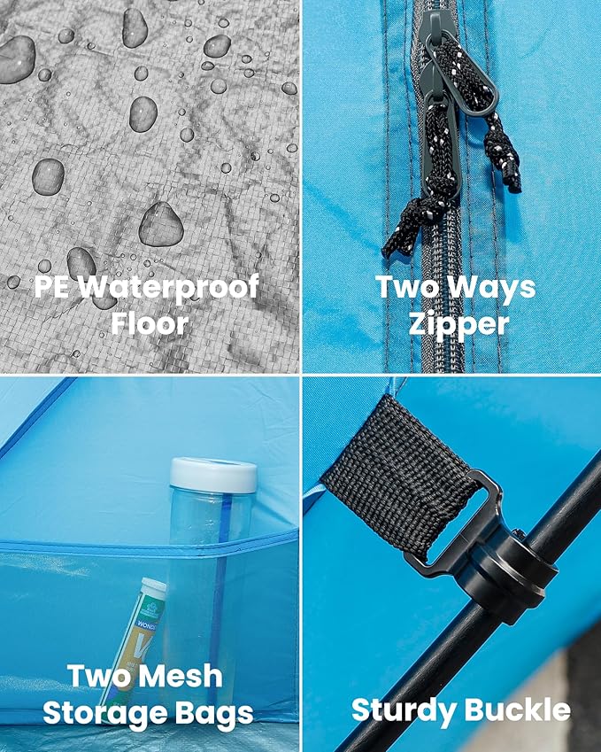 • Innovative and Versatile Design: The beach tent has a zippered door for private changing. The front floor's extension offers more space for various activities. Further more, our sun shade featuring numerous mesh panels, not only offers good visibility but also promotes cross - ventilation