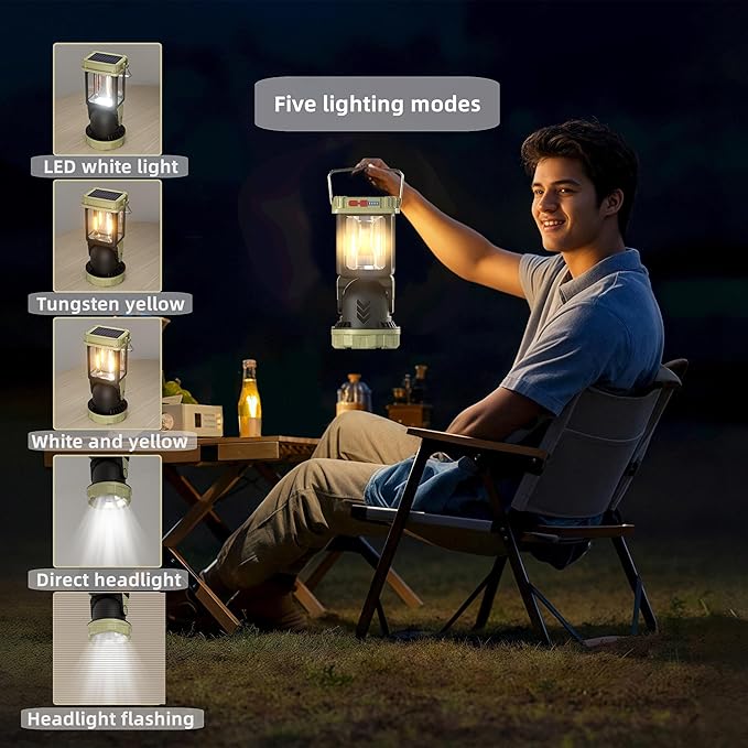 HOMY Electric Lanterns Solar Charging Gray-Green Camping Essentials LED Lights and Rechargeable Flashlight Headlight + Big Lights, 5 Light Mode Brighter Hanging Tent Lights Upgrade