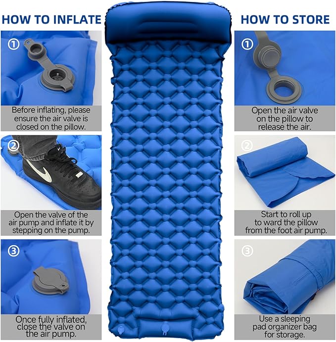 • 【30s FAST INFLATION & 1s FAST DEFLATION】This camping sleeping pad with built-in foot pump, 30s-1min fast inflate fully according foot press frequency; 1s fast deflation after open the air valveIn. High frequency hot pressing welding (non adhesive bonding), reinforcement treatment at the joint,no air leakage;Compatible with electric air pumps