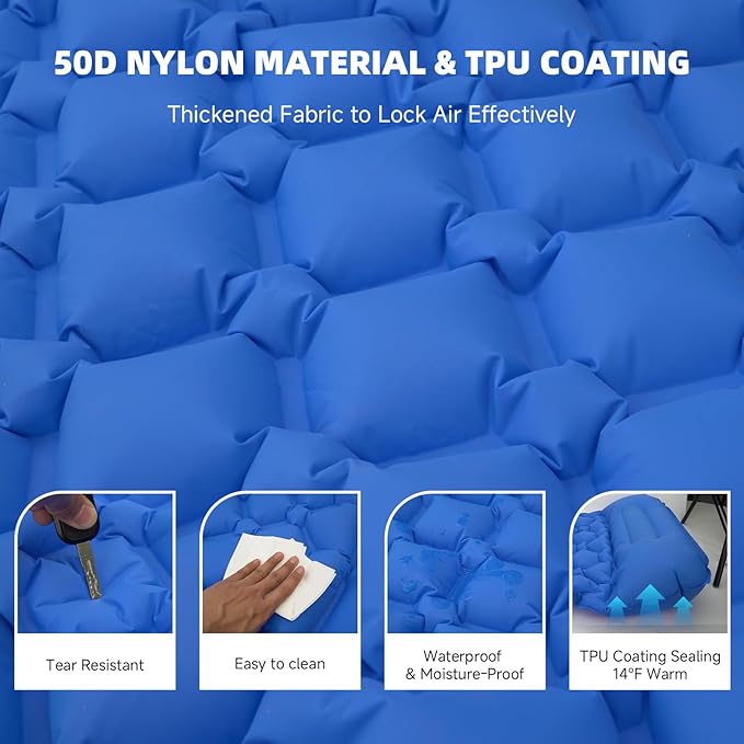 • 【ERGONOMIC DESIGN & DURABLE 50D NYLON FABRIC & TPU COATING (TEAR RESISTANT) & MUTE LAYER】Ergonomic design of honeycomb air chamber increases support, with a thickness of 5cm and comfortable body feel; This camping sleeping pad is made from high-quality 50D nylon with an inner TPU sealing coating, making it durable, tear-resistant, and easy to clean. Mute Layer: The regular sleeping pad has a loud noise when turned over, which affects sleep. Our inflatable sleeping pad has been treated with a specially added mute layer, allowing you to enjoy a quiet and comfortable outdoor camping sleep