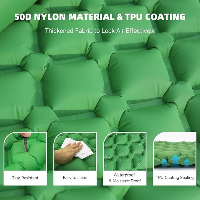 • 【ERGONOMIC DESIGN & DURABLE 50D NYLON FABRIC & TPU COATING (TEAR RESISTANT) & MUTE LAYER】Ergonomic design of honeycomb air chamber increases support, with a thickness of 5cm and comfortable body feel; This camping sleeping pad is made from high-quality 50D nylon with an inner TPU sealing coating, making it durable, tear-resistant, and easy to clean. Mute Layer: The regular sleeping pad has a loud noise when turned over, which affects sleep. Our inflatable sleeping pad has been treated with a specially added mute layer, allowing you to enjoy a quiet and comfortable outdoor camping sleep