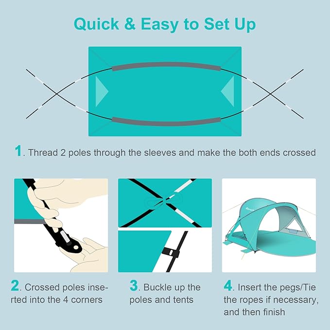 • Stable and Durable Construction: Equipped with sturdy 8.5mm thickened poles, 4 sandbags (2 on each side), 8 stakes (including 4 ground stakes and 4 plastic stakes), and 4 wind ropes, the tent can withstand 3-4 level wind forces to remain stable and secure, ensuring reliable windproof performance for your beach adventures