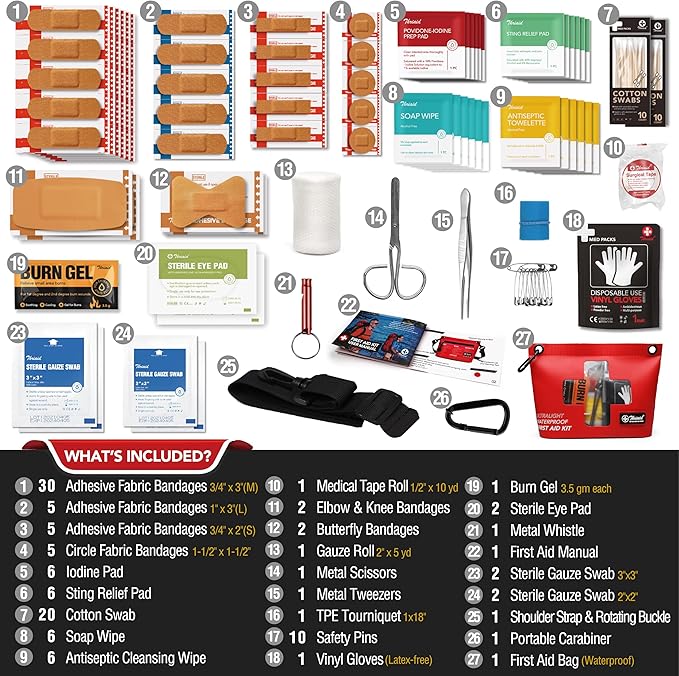 • ALWAYS READY FOR ANY EMERGENCY ▶ Leave your worries behind and cherish your every moment! This amazing first aid kit allows you to feel safe and confident 24/7! Our mission is to impress every customer with high quality first aid kits and provide the best services. If you have any question, please contact us directly and trust that we will do it right.