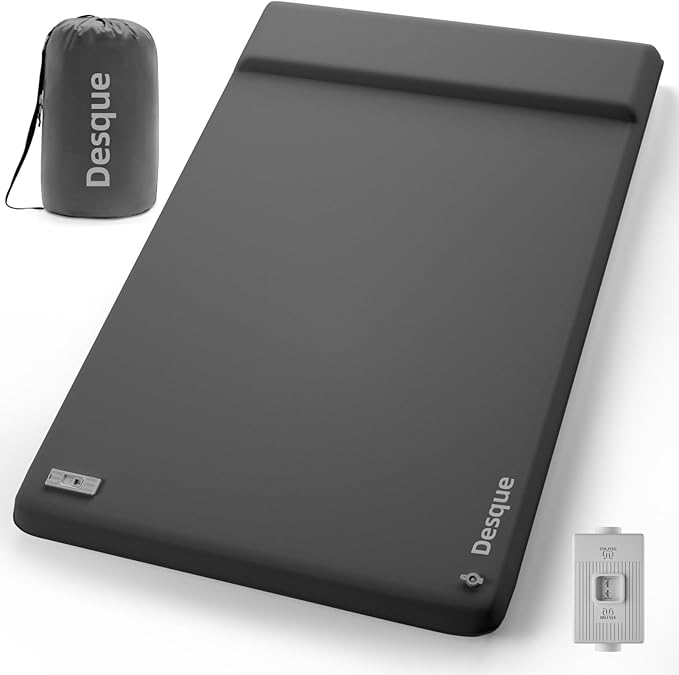 • Size 78.7" x 51" x 3.14" & weight 13 lbs: Discover the ultimate camping experience with the DESQUE Double self-Inflatable Camping Mattress, designed for convenience and comfort. Featuring a built-in electric air pump, this mattress inflates effortlessly with a single button press, eliminating the need for manual pumps or breath. Spend less time setting up and more time enjoying nature with this innovative design