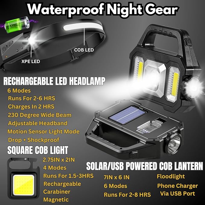 • Included Components : Solar COB Lantern, Mini COB Square Light, Raincoat, Tent, Blankets, Shovel,Compass Whistle, Knife, Pocket Chainsaw, Slingshot, Slingshot Mud Balls,, Saber Card, Light Sticks, Waterproof Matches, Waterproof Storage Pouch, Mosquito Net, Carabiners, Kindling Ropes,, Fishing Kit, Mini Alarm, Multi-Pliers, Hand Warmers, Body Warmers, Ice Packs, Tourniquet, Zip Ties, Safety Pins, Mouth to Mouth Mask, Scissors, Cotton Gloves, Bandaids, Tricot, Gauze, Cotton Balls, Medical Tape, Alcohol Swabs, Wipes,, Foraging Guide, Knots Guide, Med Kit, Compass, ParaCord, Para Bracelet, Fire Starter, Rechargeable Headlamp, Solar COB Lantern, Mini COB Square Light, Raincoat, Tent, Blankets, Shovel,Compass Whistle, Knife, Pocket Chainsaw, Slingshot, Slingshot Mud Balls,, Saber Card, Light Sticks, W… See more