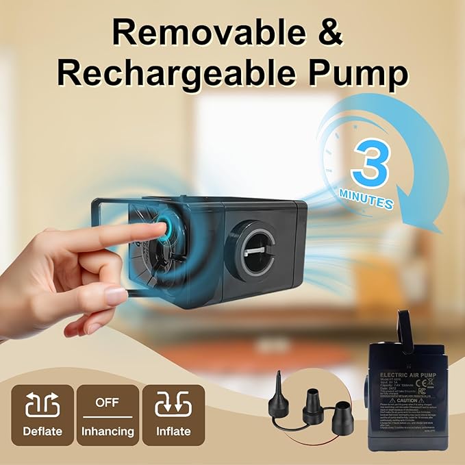 • 【Rechargeable, Detachable Portable Inflation Pump】: Compared with other air mattresses on the market, the HikerSKY air mattress queen with built in battery pump comes with a wireless lithium - battery - powered inflatable pump. Whether you're soaking up the sun in the garden in winter or camping outdoors in summer, you can bid farewell to the hassle of having no power supply. This rechargeable pump comes with a USB charging cable.