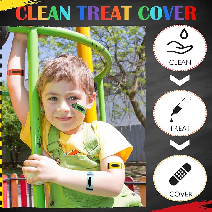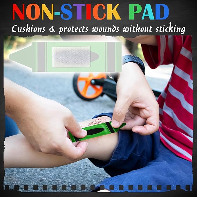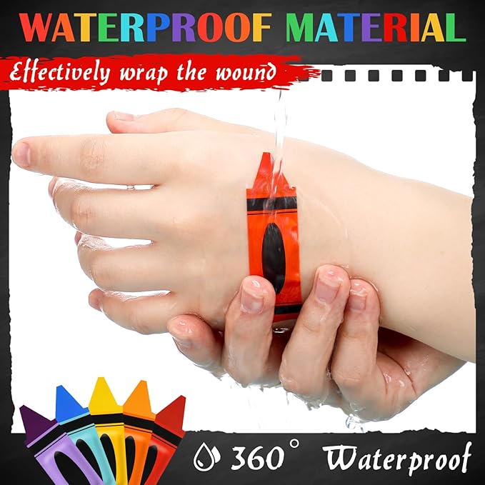 • Vibrant and Fun Crayon Bandages: enhance nice using process with a touch of fun and color; Our crayon bandages come in classic crayon image and vibrant colors, playfully conveying messages like [CRAYON BANDAGES]; These back to school bandages make wound care less daunting, promoting a positive using experience