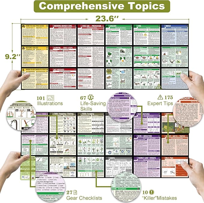 • Comprehensive Survival Information: Packed with 67 essential life-saving skills and 175 expert tips , this fold-out survival gear and supplies component covers critical topics from first aid and water sourcing to shelter-building and natural disaster response, making it a reliable tool in any survival situation.