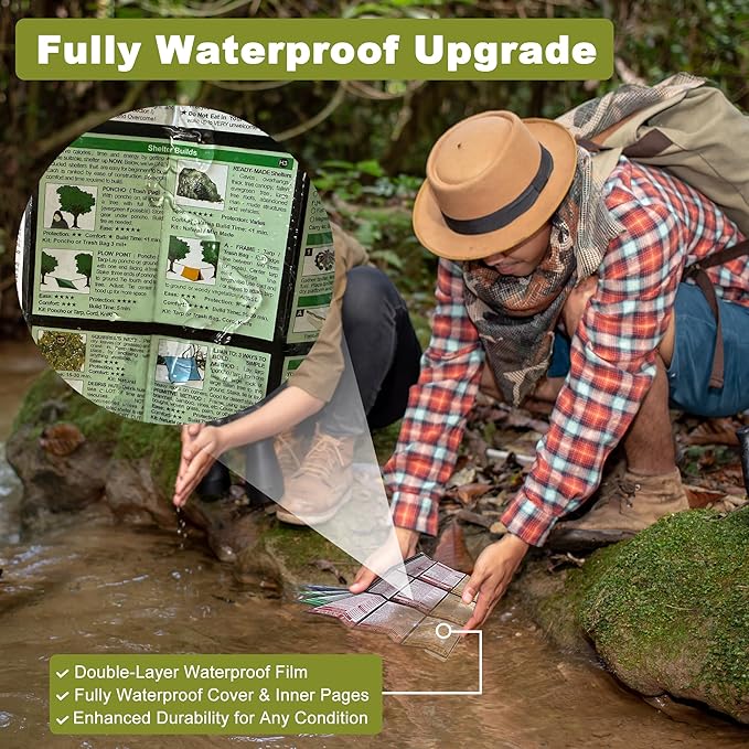 • Built to Last & Enhance Readability: The waterproof survival guide is fully covered with a robust plastic film on both the cover and inner pages, offering complete waterproof protection against rain and stains, significantly extending its lifespan. Additionally, a magnifying tool is included for enhanced font clarity and readability.