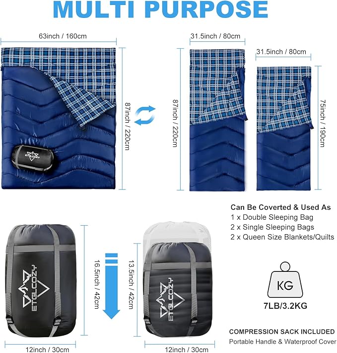 • DOUBLE THE SPACE, DOUBLE THE COMFORT! Why settle for cramped when you can have comfy? Our extra-wide sleeping bag gives you and your partner plenty of room to stretch out. It’s like having a king-size bed in the great outdoors—minus the fancy headboard.