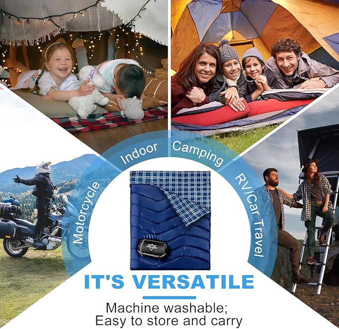 • CAMP LIKE A PRO, SLEEP LIKE A BABY! BECAUSE THE BEST ADVENTURES START WITH A GOOD NIGHT'S SLEEP! Whether you’re a seasoned camper or a first-timer, our flannel sleeping bag has got your back (and your front, and your toes). With unbeatable warmth, extra width, and cloud-like softness, you’ll wake up refreshed and ready to conquer the wilderness—or at least the campfire breakfast.