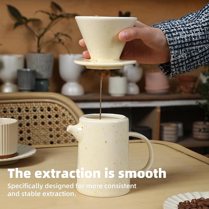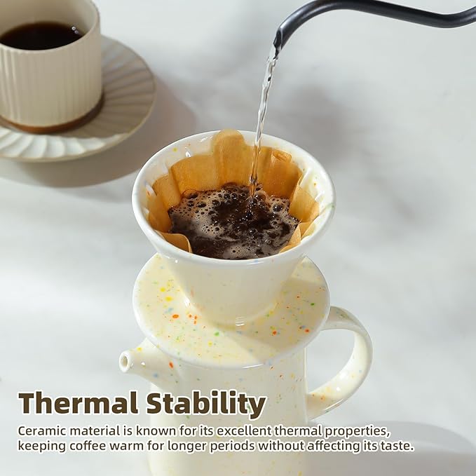 • High Quality Material: Drip coffee pour over set made of high tempreture porcelain, with good heat preservation and durability,non toxic,ceramic dripper does not absorb odors or pass on chemical taste into your brew,ceramic design prevents heat loss during brewing.