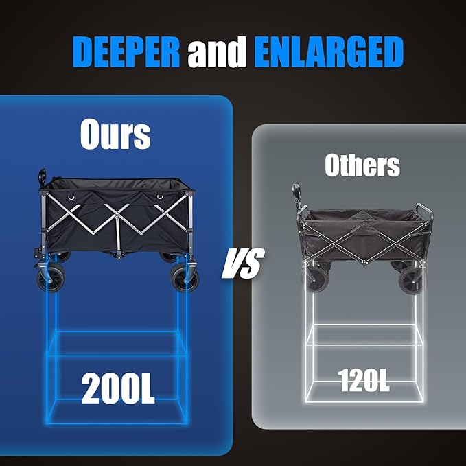 • 450 lbs Heavy-Duty Capacity: Built to haul bulky loads, this foldable wagon supports up to 450 lbs and offers 200L storage space (35.43"×19.68"×15.74"), making it ideal for groceries, camping gear, sports equipment, or gardening supplies. No more multiple trips