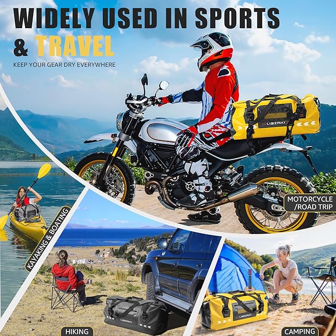• 【EASE OF USE & STORAGE】: Durable zipper closure and reinforced top carry handles with an exterior mesh zippered pocket and interior pockets for quick access to items and a place for essentials such as keys or a cell phone. Oversized opening and spacious interior simplify loading. Waterproof travel duffel bag folds for easy storage when not in use. Equipped with four quick-release straps, it is easy to secure the duffel bag anywhere on your motorcycle, kayak, or bike.Easy to clean and wipe down for instant shine.