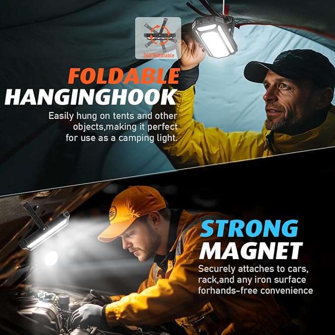 • 360° Hook & Strong Magnetic Base - The 360° hook design allows the camping lantern to be hang on objects such as tents. Our rechargeable camping lights comes with Built-in strong magnet, which make it can be firm stay on car, track or any other metal surface for use as working lights.